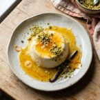 - Drizzle the orange sauce over the top of each panna cotta and finish with a dusting of pistachio.