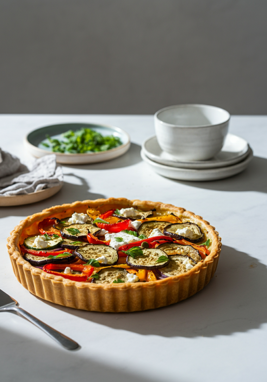 A vibrant tart filled with sweet roasted vegetables, salty feta, and rich ricotta, all baked in a flaky crust. Perfect for a sophisticated lunch or light dinner.