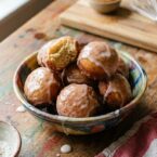 - Remove to cool on wire racks for 5 minutes, then gently roll in confectioner’s sugar or sugar and cinnamon mixture, or allow to fully cool, then dip in glaze.