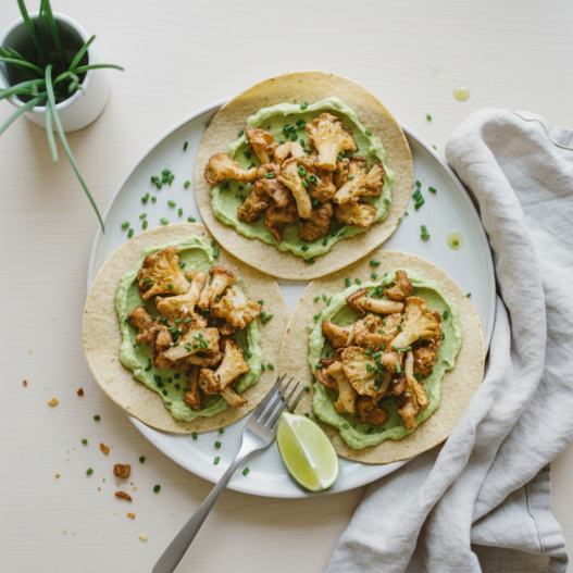 - Warm tortillas, add avocado puree, and top with oyster mushrooms. Top with chopped chives and serve with a lime wedge.