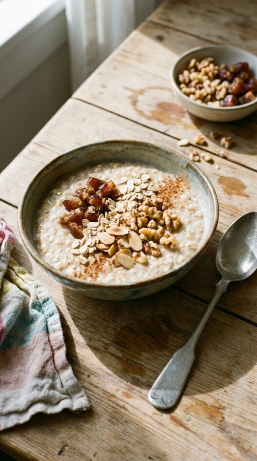 - Garnish the oat bowl with additional chopped dates, a sprinkle of raw oats, some cinnamon, and a few more toasted walnuts and almonds for added texture and flavor.