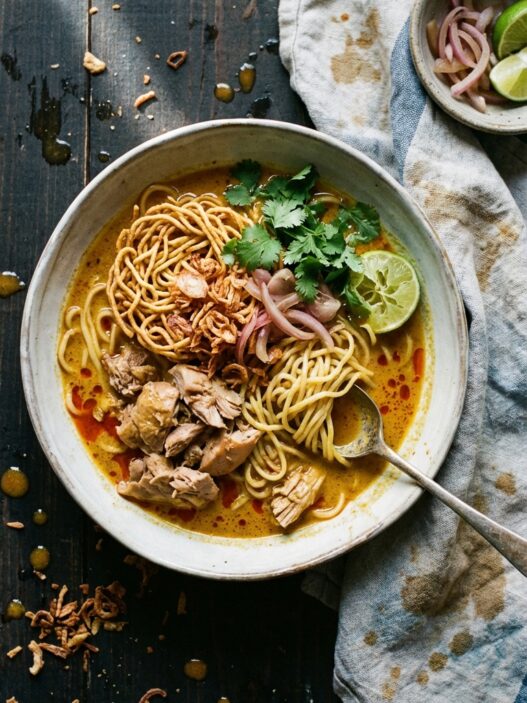Spicy, savory noodles with tofu. A quick weeknight meal inspired by Thai and Lao cuisine.