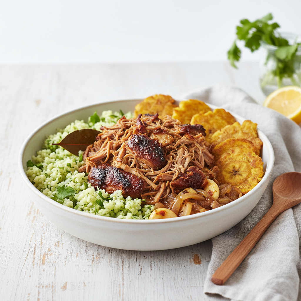 Tender pulled pork, crispy tostones, and cilantro-lime cauliflower rice make a satisfying and healthy meal. Perfect for a weeknight dinner or a casual get-together.