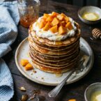 Fluffy pancakes layered with jam and whipped cream, topped with sweet persimmons and a honey drizzle. The perfect autumnal breakfast (or dessert!).