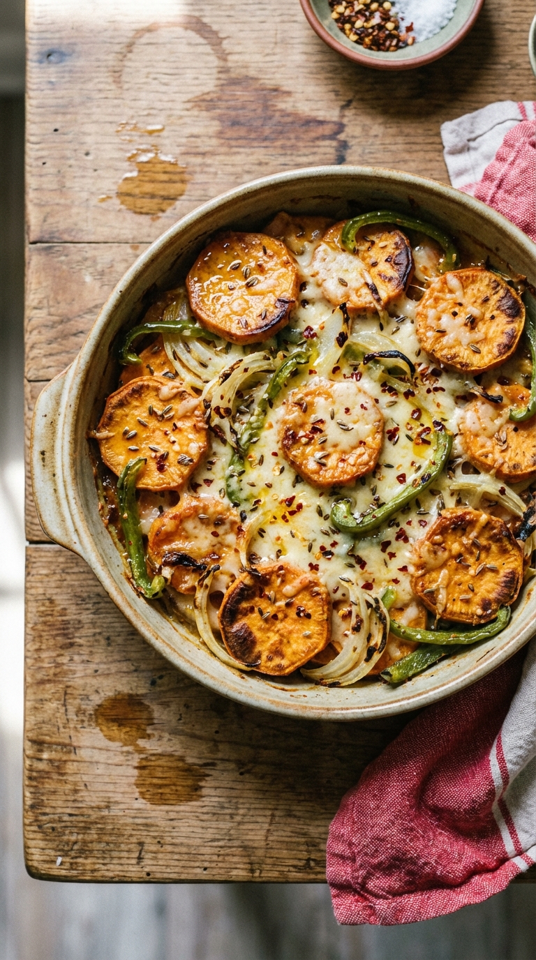 Panch phoron is underused in Western kitchens, and sweet potato gratin is exactly where it belongs. The spice blend, a mix of fenugreek, nigella, cumin, mustard, and fennel seeds, has a warm complexity that works against the sweetness of roasted potato in a way that plain cumin or paprika never quite manages. Parmesan on top is not fusion. It’s just fat and salt doing what they do. This is a side dish worth centering a meal around, not an afterthought.