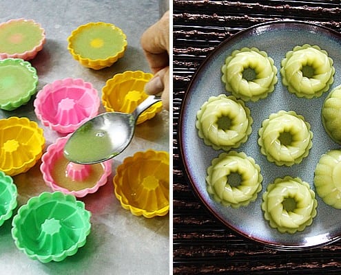 - In a bowl, mix together the pandan juice and coconut milk. Then pour into the simmering agar-agar mixture, stirring constantly until the mixture come to a boil. Once it reaches a rolling boil, take the pot off the heat immediately and pour the mixture into jelly mould or shallow glass dish of cake tin measuring approximately 16 cm (6 ½ inches) across.