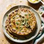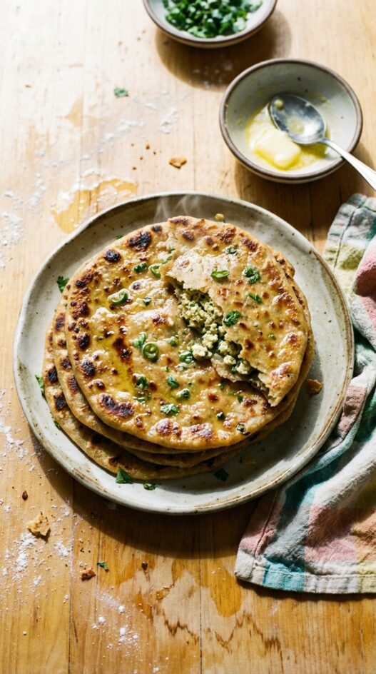 Paneer parathas are one of the things I get genuinely excited to make on a weekend morning. There is something about pulling apart a warm, spiced flatbread and seeing the paneer filling inside that never gets old. Soaking the paneer in hot water before crumbling it softens it and removes any sour edge, and that small step changes the filling entirely. The dough itself, made with stone-ground chakki atta, has a nutty, slightly rough texture that holds up to rolling without tearing. Green chili and fresh cilantro folded into the paneer keep every bite lively. Cook them on a dry tawa until spotted and golden, then finish with a brush of butter while still hot. Serve with yogurt or pickle. I usually eat the first one straight from the pan.