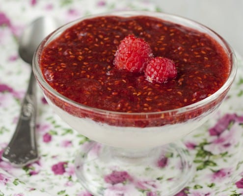 - Once the panna cotta is set, top each serving with the raspberry sauce. Serve chilled.