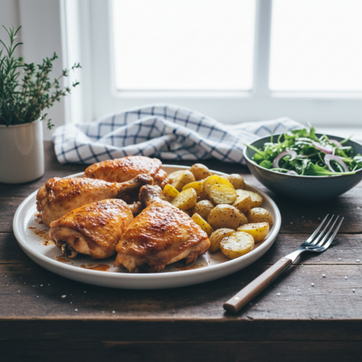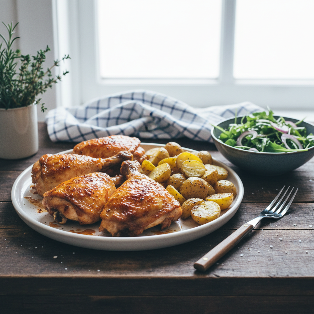 - Continue roasting the chicken for another 35–40 minutes, basting once with pan juices halfway through, until golden and crisp (internal temperature 165°F / 74°C). Roast the potatoes alongside until golden and tender, about 30–35 minutes total.