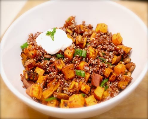 Rosemary, Garlic, and Paprika Roasted Sweet Potatoes with Quinoa, Spicy Pepitas, and Horseradish Yogurt Sauce