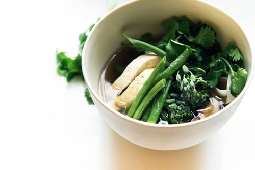 - To serve, divide the parsley root noodles and broth among bowls. Top with crispy baked tofu, fresh cilantro, and sliced scallions.
