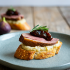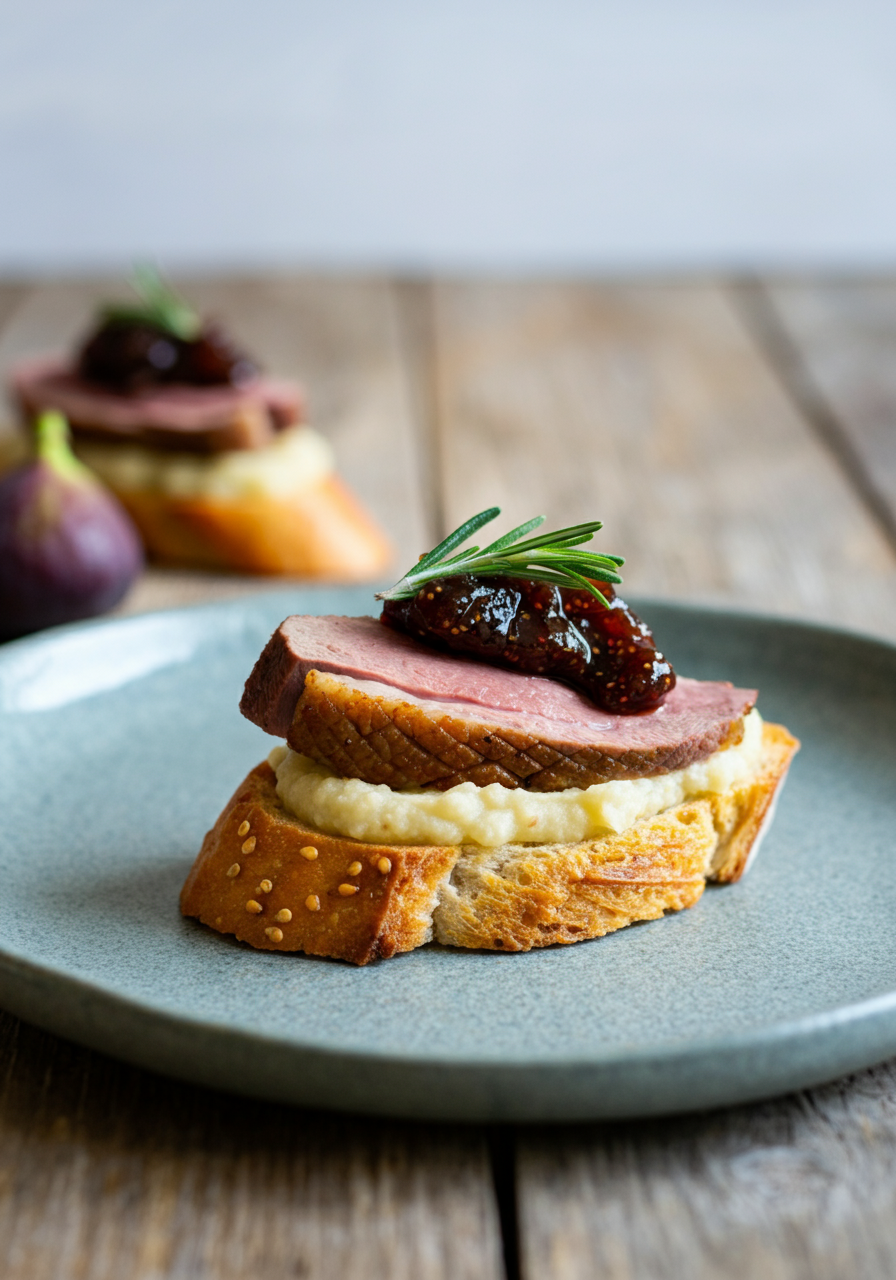 - Assemble the crostini: Heat the duck confit or duck breast. Spread the bottom of the crostini with parsnip puree. Top with a slice of duck confit. Garnish with a small dollop of fig preserves and fresh rosemary.