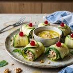 - Spread some of the tuna and mustard filling on a zucchini strip, lay 2 mint leaves on top, then roll it up into a bud-like shape.