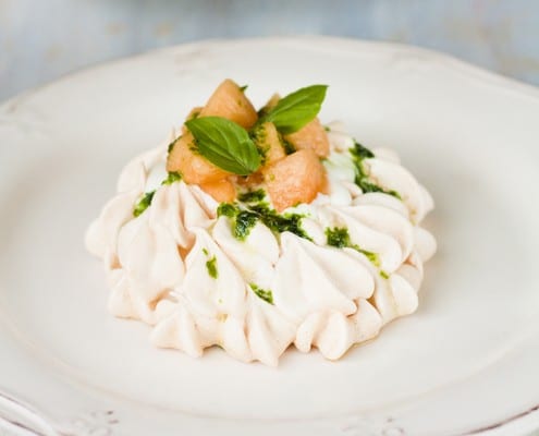 - For the basil coulis, blend fresh basil with agave nectar or honey until smooth. Drizzle over the melon-topped Pavlova.