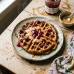 Sweet and salty waffles made with peanut butter batter and topped with strawberry preserves. A fun twist on a classic!