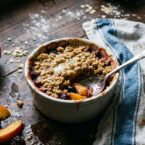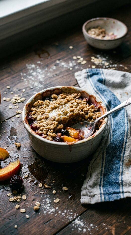 August in my grandmother’s kitchen meant fruit crisps. Big difference. She never used fresh fruit when frozen was available, which I thought was corner-cutting until I understood she was right. Frozen peaches and berries release more juice as they bake, and that juice bubbles up through the oat topping and caramelizes around the edges. The coconut oil in the topping is what makes it crumble properly without feeling greasy. Lime juice over the fruit instead of lemon keeps it from tipping too sweet. Two ramekins, thirty-five minutes, and something that tastes like summer even in February. Serve warm with something cold on top.