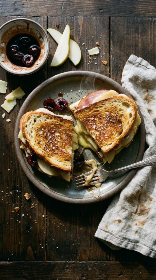 Sweet pears and creamy Gouda elevate the classic grilled cheese. A balsamic cherry glaze adds a sophisticated touch.