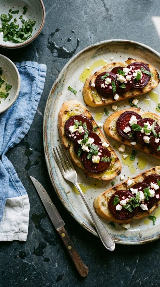 Grilled beets and creamy feta meet toasted baguette for a vibrant appetizer. Perfect for a casual get-together or a light lunch.