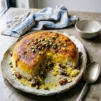 Persian rice with dates, chopped pistachios and aromatic cardamom is steamed together with an addictive and crunchy saffron crust called tahdig.