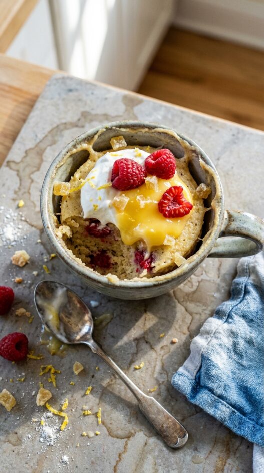 A Raspberry Lemon Mug Cake, hot out of the microwave and topped with whipped topping, lemon curd and fresh raspberries, a perfect, quick treat.