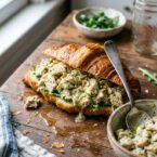 Creamy pesto chicken salad, served in a lovely croissant, perfect for a quick lunch or light dinner.