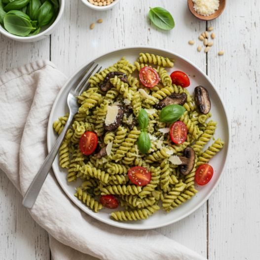 PrintPesto Pasta with Shiitakes and Tomatoes