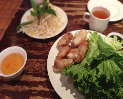 The spring rolls, on the other hand, were heavenly, crispy, piping hot rolls of pork and mushroom that came on broad lettuce leaves and mint which we used to wrap and dip them in a thin, sweet sauce. Dessert looked intriguing, with offerings of Vietnamese flan, and avocado juice, but we were too full of pho and memories to try anything else.