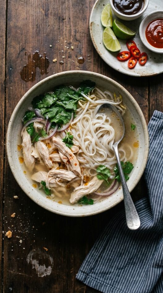 Good pho takes two things seriously: the broth and the toppings. Skip either and you’ve got warm noodles in slightly spiced water. This chicken version works because toasting the coriander seeds, cloves, and star anise before they hit the pot pulls out oils that a quick simmer would never reach. The broth needs 20 minutes, minimum, and needs to be skimmed. Cloudy pho isn’t wrong, but a clear broth signals care. At the table, the fresh herbs and bean sprouts aren’t garnish. They’re half the recipe. Add them generously, squeeze the lime into the bowl, and adjust fish sauce and sriracha to your own threshold.