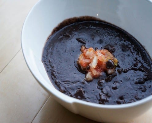 Now we know why beans are so popular, but I must admit that it is easy to get stuck eating them the same way. Beans and rice, beans in a burrito, bean salsa, beans sprinkled in a salad, black bean burgers, beans beans beans! What about puréeing the beans and making a smooth black bean soup? Enter Piri Piri Turtle Soup! A hearty soup made by simply puréeing cooked black beans, stewed piri piri chilies and adding a spoonful of homemade salsa on top. This recipe required a big pot and a food processor. For the salsa just throw in a medium tomato, half of a medium onion and a small handful (about 3 tablespoons worth) of fresh cilantro. Salt and pepper to taste. And making the beans is much easier than that!