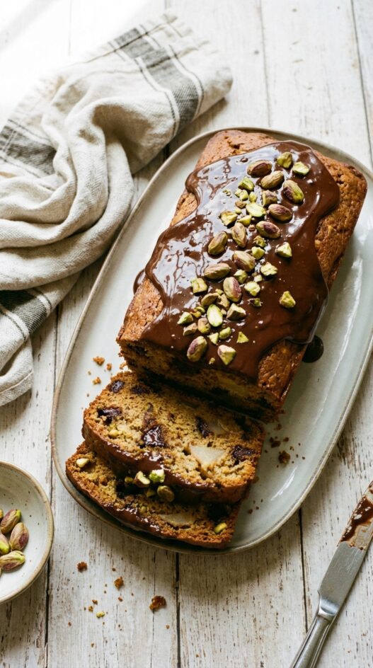 Pistachio, dark chocolate, and pear in a loaf cake sounds like a combination that needs explaining, but once you’ve made it you stop second-guessing it. The pear keeps everything moist in a way butter alone doesn’t quite manage, and the chocolate chunks stay distinct rather than melting into the crumb. Pistachios get pounded to a rough, breadcrumb texture before going in, which distributes their flavor throughout without turning the batter green. Then you pour ganache over the top, which takes it from something you’d have with coffee to something you’d actually serve to people you want to impress. The loaf format is generous; it slices cleanly the day after baking and keeps well.