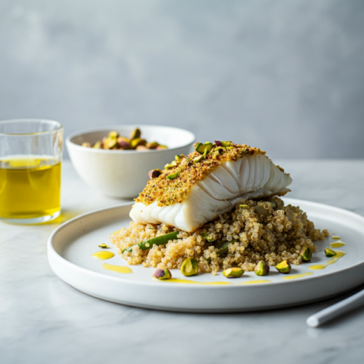 Flaky fish gets a crunchy pistachio crust, served with vibrant lemon-spinach quinoa. A healthy and delicious weeknight meal.