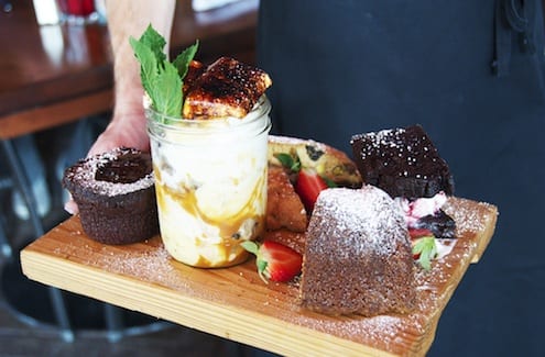 We were presented with a dessert platter worthy of royalty: Pistachio Brown Butter Bundt Cake with preserved bing cherries, pistachio gelato, Devils Food Cake Ice Cream Sandwich sour cherry-vanilla gelato, Caramelized Banana Sundae In A Mason Jar banana bread, walnuts, caramel sauce, vanilla ice cream, burnt marshmallow (The Chef’s Favorite), Warm Chocolate Stout Brownie Sundae double chocolate stout with straticella gelato, Hot Granny Smith Apple Strudel with maple-walnut ice cream and caramel sauce. Everyone was thrilled to have the opportunity to share these festive desserts and after a taste, nothing but smiles emanated from the table.