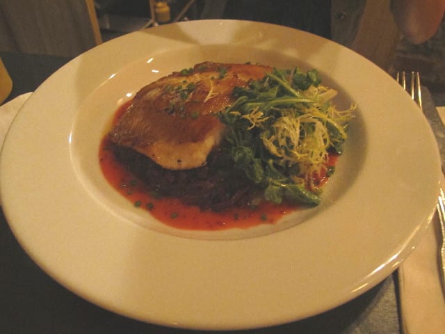 My friends shared an assorted sausage sampler (I guess they hadn’t had enough sodium yet), which at $15 per person is enough to feed a small army. Me – I’m watching my waist, so I dove into the evening’s special – seared blackfish over fermented and sauteed red cabbage, that was perfectly cooked and delicious to boot…
