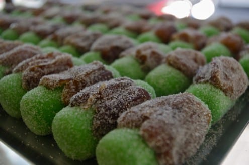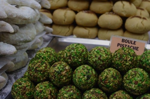 In the center of the room, there is a large square counter heaving under the weight of huge mounds and trays of Tunisian sweets. Brightly colored green rounds of pistachios mingle with pastry cones filled with nuts and drizzled with syrup, and ropes of golden pastry soaked in honey.