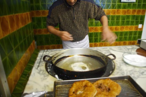 As he stretched the dough in his hands, standing behind a bubbling vat of oil, Mr Said told me that it takes six hours to prepare the dough. They start early each morning mixing the flour and by four in the afternoon it’s ready for frying.