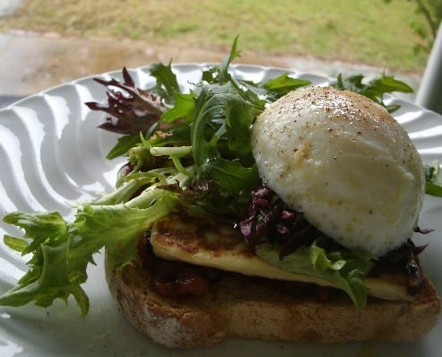 PrintPoached eggs with Pomegranate and Chilli Jam and Fried Haloumi