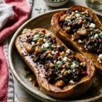 Sweet butternut squash is baked until tender, then filled with a savory bison and balsamic stuffing. A perfect fall side dish!