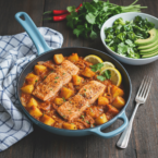 A fragrant and quick one-pan dry curry featuring tender salmon and potatoes in a bold, spicy tomato-coconut sauce.