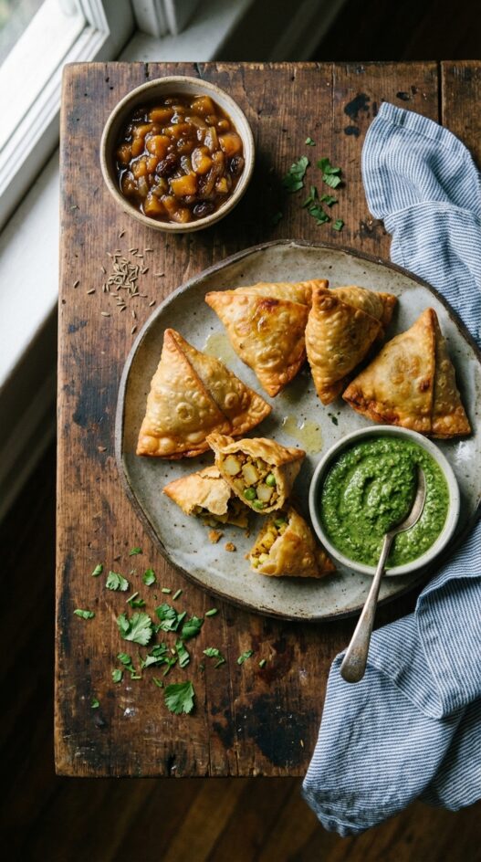 Crispy potato samosas, spiced to perfection, are the star alongside a vibrant mango chutney and a cooling cilantro-peanut chutney.