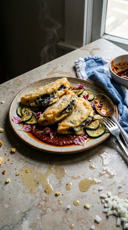 Crispy pumpkin blossoms filled with creamy huitlacoche and cheese, served with a vibrant chile morita sauce. A unique and delicious appetizer!