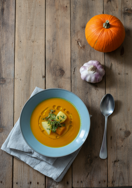Pumpkin soup gets a bad reputation for being one-note, and most versions deserve it. Parsley root is what changes the equation here. It’s not as sweet as parsnip and has an earthiness that keeps the pumpkin from turning cloying. If you can’t find parsley root, celeriac does a similar job, though with a slightly different character. The chili flakes go in at two stages, which gives you heat without making the soup aggressive. This is a proper winter soup, not a garnished smoothie.