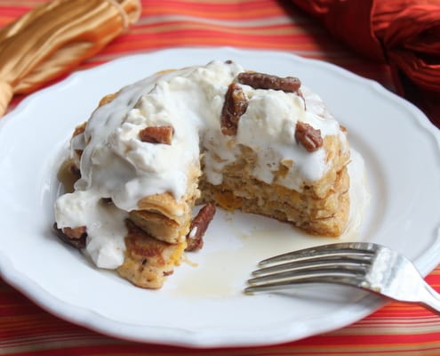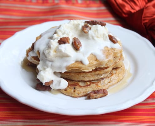 These pumpkin pie {buttermilk} pancakes are a comforting breakfast when served simply with maple syrup. However, with maple cinnamon whipped cream and maple pecans they quickly become a decadent dessert. The nutrient-rich pumpkin adds a beautiful orange hue to the pancakes as well as lots of vitamins. The optional addition of oatmeal adds whole grain and other nutrients. The finishing touch of maple cinnamon whipped cream and maple pecans is admittedly not the healthiest option but for a special Thanksgiving breakfast, you’ll be thankful that you indulged!
