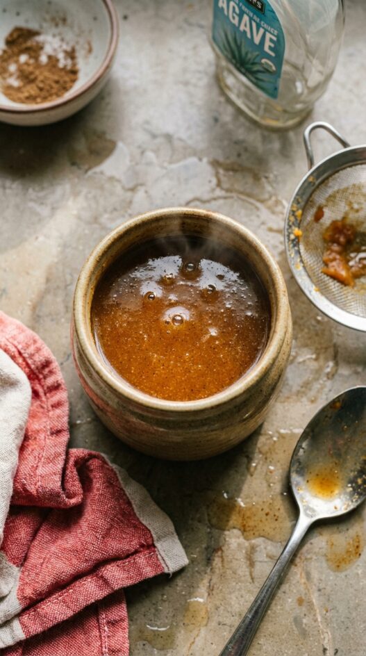 Boiling can cause the agave to caramelize too quickly, darken in color, and develop a bitter edge. Low, gentle heat keeps the syrup smooth and preserves the balanced spice flavor.