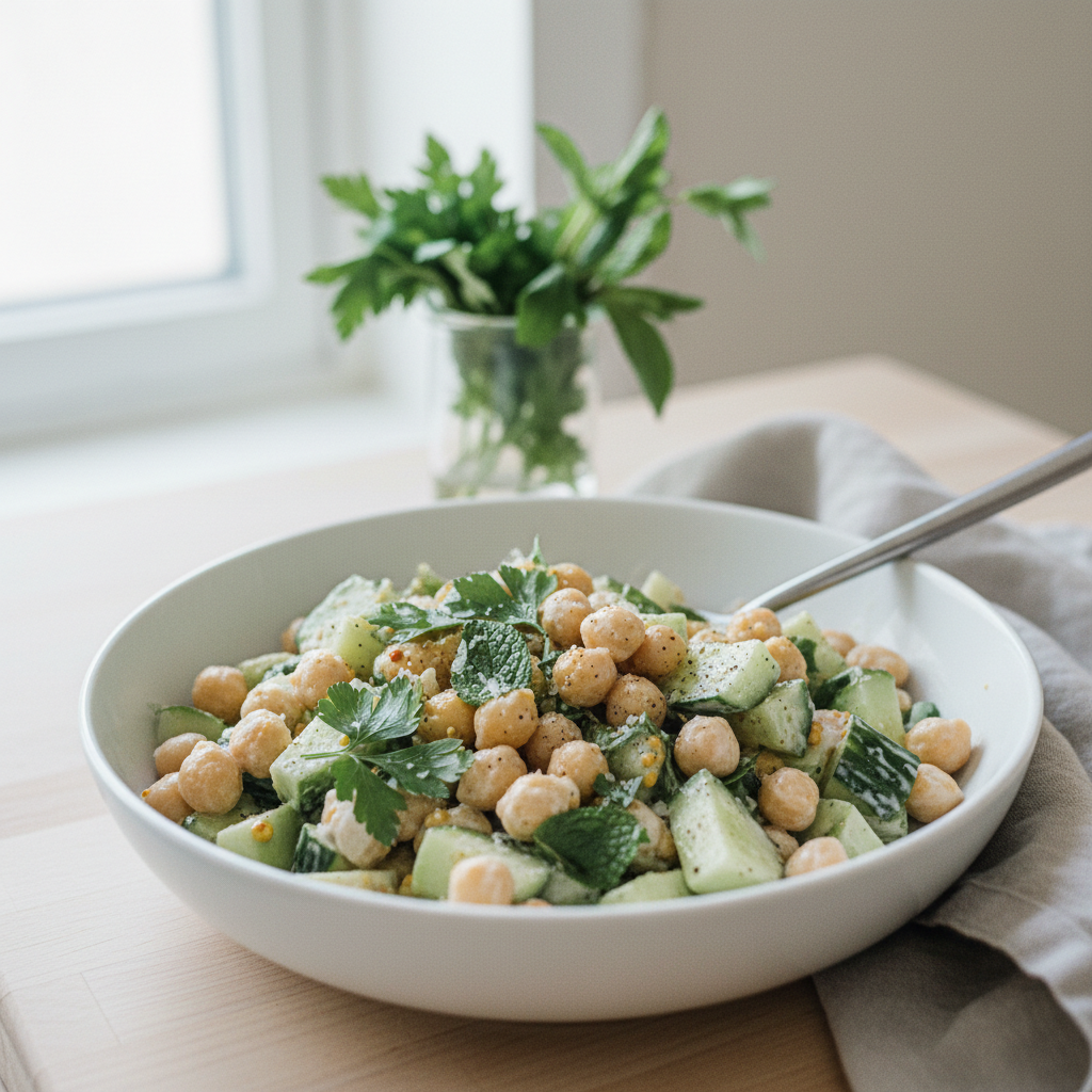 This salad takes about fifteen minutes, uses mostly pantry ingredients, and works as lunch or a side without needing any heat. Chickpeas, cucumber, fresh parsley and mint dressed in Greek yogurt, Dijon, and lemon. Keep it simple. Cold, bright, and substantial enough to eat on its own. Patting the chickpeas dry before mixing matters more than people expect. Wet chickpeas make the dressing watery. Dry ones hold the yogurt coating and give each bite some grip. The mint is worth measuring properly too; too little and it reads as plain chickpea salad, too much and nothing else gets through.
