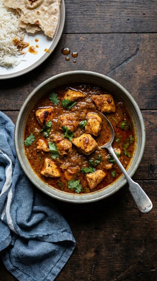It’s made with chicken breasts, which cook quickly and stay tender if you don’t overdo it. The same sauce also works well with tofu, paneer, or mixed vegetables — a good reminder that a reliable curry base can carry almost anything you have on hand.