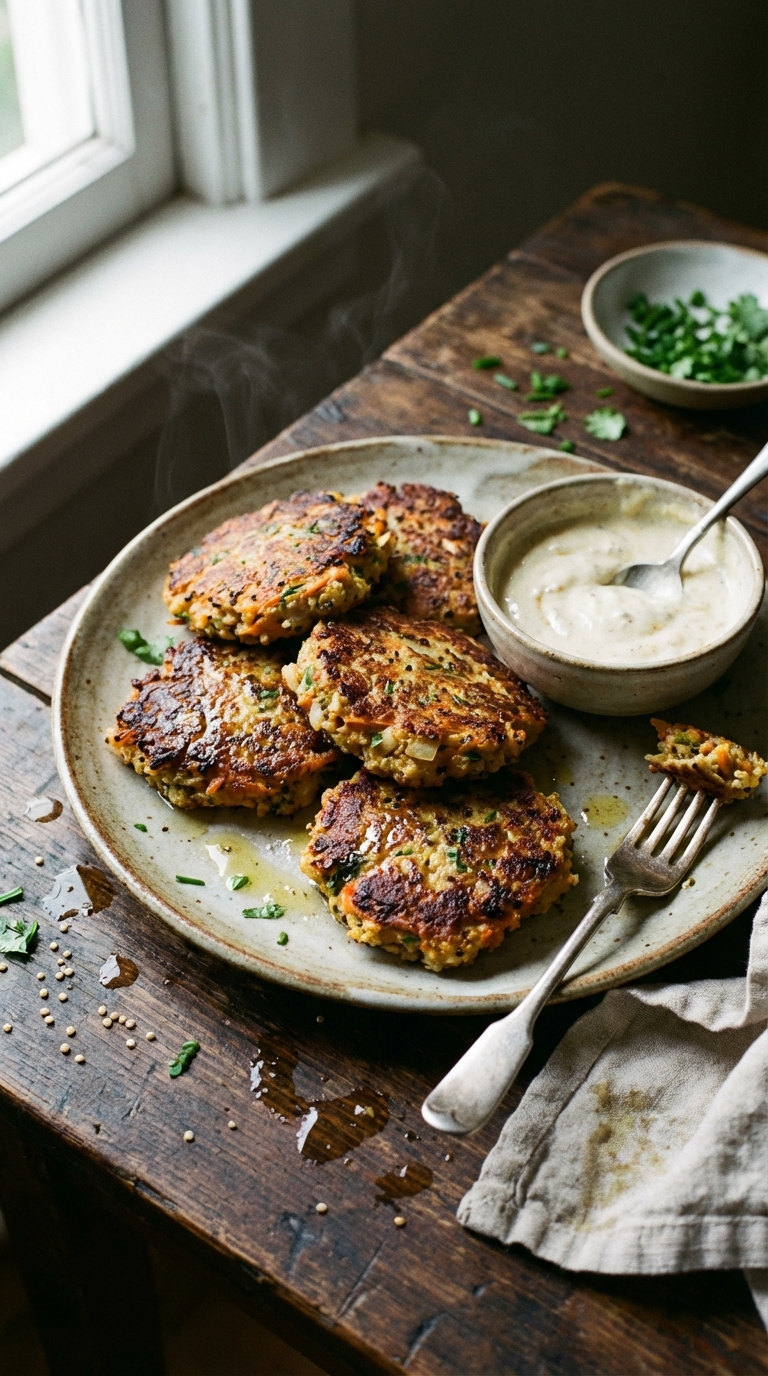 Crispy quinoa fritters, herbed and flavorful, are the perfect appetizer. Serve with a creamy garlic aioli for dipping.