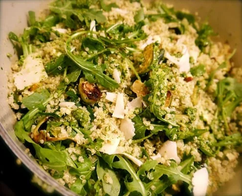 - In the large bowl with the quinoa, add 2 tblsp of olive oil, add in the brussels sprouts, add half of the pesto and toss well. Add the arugula, green onion/scallions, dates and avocado cubes to the bowl, toss again lightly, place into bowls, then garnish with toasted almonds and shaved cheese. Add remaining pesto as desired. Finish with a generous amount of freshly cracked black pepper and salt to taste.