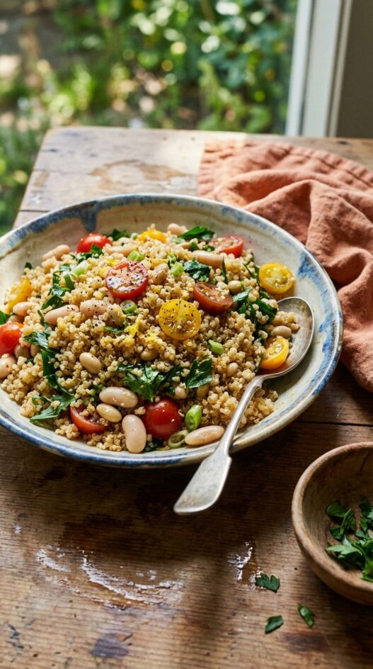 I made this quinoa salad for a potluck years ago and brought the recipe card along because I figured someone would ask. Easy fix. Toasting the quinoa in a dry pan before adding the broth is the step most recipes leave out, and it’s the one that makes it taste like something rather than just a protein-forward filler. Soybeans and white kidney beans together sound redundant, but they give the salad heft without making it heavy. Bright parsley, scallions, cherry tomatoes, and a mustard-lemon dressing keep it from going stodgy. Good the day it’s made, better the next morning.