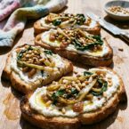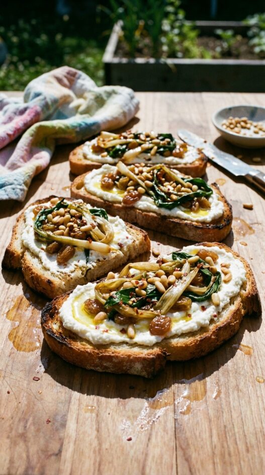 Ramps sauteed until golden, tossed with vinegar-soaked golden raisins, toasted pine nuts, and chili flakes. Served on broiled country bread spread with whipped, drained ricotta.