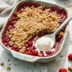 The rhubarb is tart enough to stand up to the sweet crumble. The raspberries dissolve into a jammy sauce between the rhubarb pieces. A scoop of vanilla ice cream on top melts into the hot fruit and turns into a warm-cold, sweet-tart pool. We keep making this on repeat when rhubarb is in season.